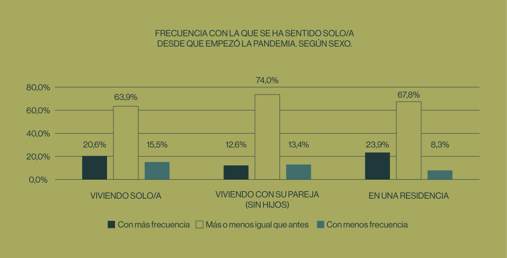 La pandemia tuvo un efecto inmediato en nuestras vidas, pero también tuvo un impacto a largo plazo. Nuestros datos se recogieron en el año 2022. En ese momento, preguntamos a las personas mayores que participaron en la encuesta cuánto había influido la pandemia en su sentimiento de soledad. Como se ve en el gráfico a continuación, un 20% de las mujeres se han sentido solas con más frecuencia desde que empezó la pandemia. Lo mismo les ha ocurrido al 14% de los hombres. No es de extrañar, ya que el 21% de las personas mayores que participaron en nuestro estudio perdió al menos un amigo a causa de la Covid-19. El problema es especialmente importante para las personas que viven en una residencia o que viven solas en casa.
