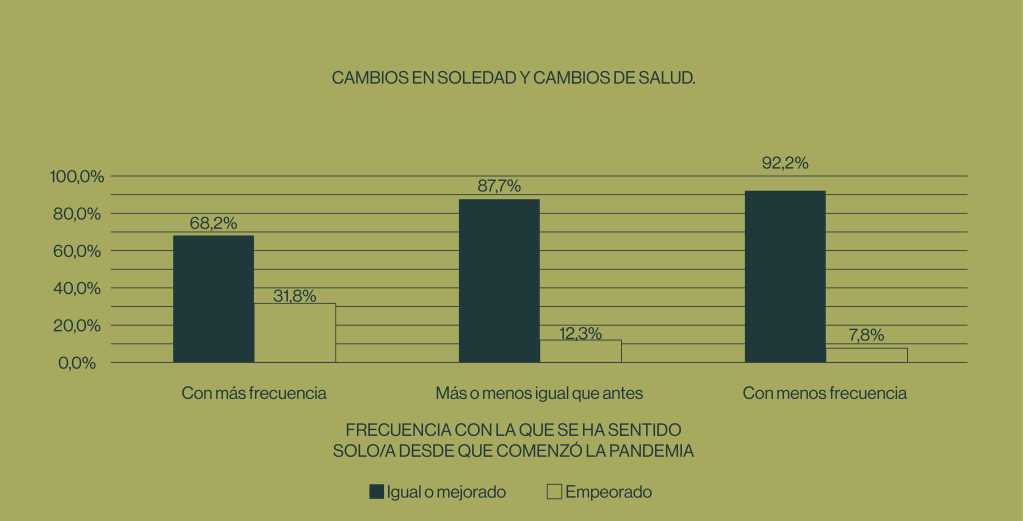 Este incremento en el sentimiento de soledad tiene consecuencias graves en la vida de las personas mayores. Como ejemplo, podemos pensar en su efecto en la salud. Y es que casi el 32% de las personas que experimentan más soledad desde que empezó la pandemia considera que su salud ha empeorado desde el confinamiento.